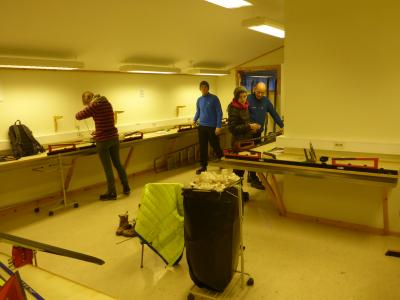 Vorbereiten der Ski in der Skihütte, laut Tore sei ich ein echtes Waxtalent: