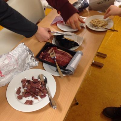 Die Woche über wurde ins in Norwegisch nicht nur die Sprache, sondern auch die norwegische Lebensweise etwas näher gebracht, beziehungsweise vorgelebt. Uns wurden kulinarische Spezialitäten angeboten: Brunost (Molkekäse), Gammelost (Sauermilch-Schimmelkäse), sowas wie Schaafsschinken, geräuchertes Rentier und Trockenfisch. Der Trockenfisch wird im Süden (Herkunft des Lehrers) den Hunden zum Fraß vorgeworfen, hier oben wird er als Snack verzehrt. Die Geruchsfahne des Fischs konnte ich nicht überwinden, den Rest habe ich probiert. Weshalb ich vermutlich auch kein Geschenk vom Weihnachtsmann dieses Jahr bekommen werde. So ist das halt wenn man dessen Zugmaschinen verspeist.