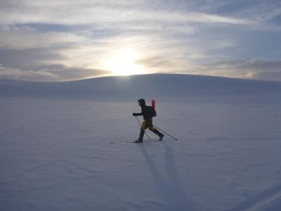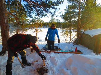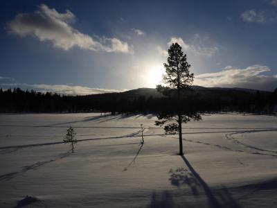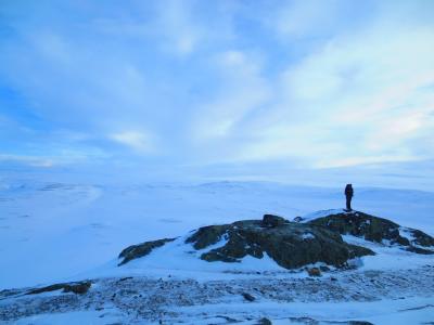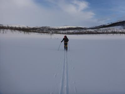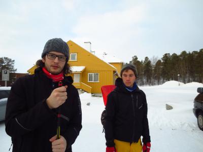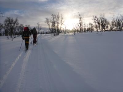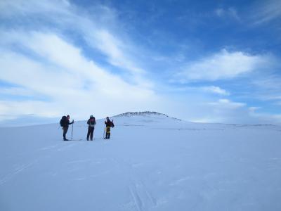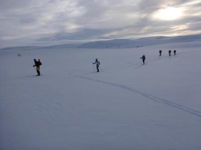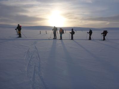 Der Bus brachte uns am Freitagmorgen (20.02.) nach Sarvesjok. Ziel war ein Gipfel (dessen Name ich mit lateinischen Lettern nicht schreiben kann) oberhalb der Baumgrenze. Auf dem Weg dorthin überquerten wir zugefrorene Seen und haben uns den nächtlichen Unterschlupf von Schneehühnern angeschaut. Die scheißen sich ein, damit es warm in ihrem Loch wird. Aufzufinden war aber kein Schneehuhn mehr, sondern nur noch… Jedenfalls waren wir am Freitag, wie schon am Mittwoch mit prachtvollem Wetter beschenkt, sodass Schaufel und andere Überlebensstrategien für stürmische Gezeiten nicht zum Einsatz kamen. Man konnte sogar einen Blick der Gipfel von Seiland erhaschen.