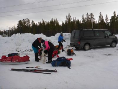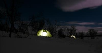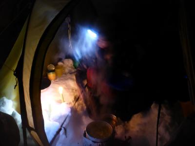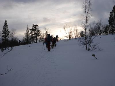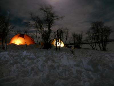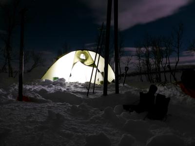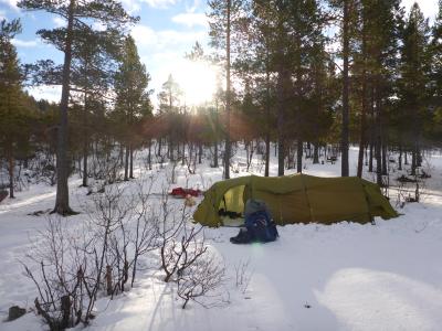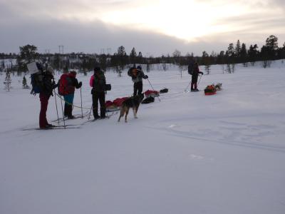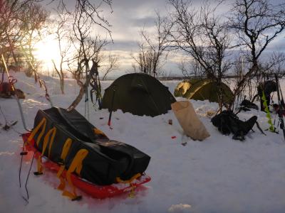 Tiefschneepassagen, Stürze und Einsinken imSchnee waren verantwortlich dass so manche aus der Gruppe die weiße Fahne schwenkten und wir immer wieder Pause machten. Noch bei Tageslicht hat jede Gruppe ihr Zelt aufgebaut. Bevor in den Vorzelten Essen gekocht wurde, haben wir noch allgemeine Aufgaben erledigt – Wasserzugang schaffen, Feuersstelle ausschaufeln, Feuerholz sammeln, Hundefutter zubereiten, Toilette in Schnee graben/bauen (sodass alle an der gleichen Stelle ihr Geschäft verrichten und im Sommer dann nicht überall Überreste vorzufinden sind, Toilettenpapier wird aus selbigen Gründen verbrannt). Gestärkt genossen wir am Lagerfeuer den seichten Abend, leider ohne Nordlichter.