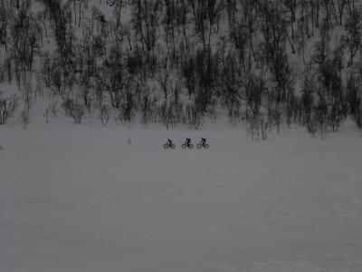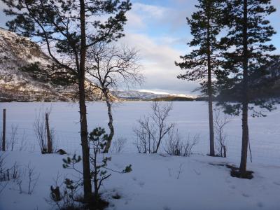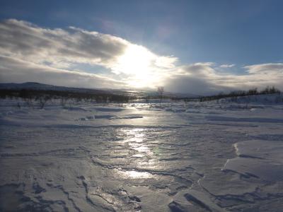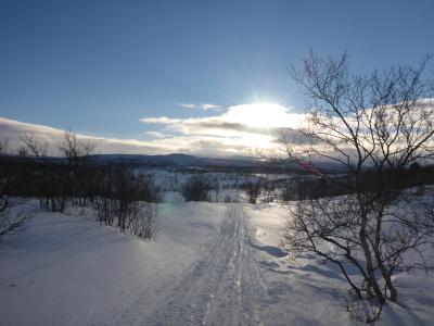 Über Nacht hat an meiner Rute hat sogar Fisch angebissen. Nachdem ich alles Geraffel wieder in Rucksack und Schlitten verstaut hatte, habe ich mich auf den Rückweg nach Alta gemacht, den die Anderen mit dem Auto gefahren sind. Das schöne frühlingshafte Wetter habe ich einerseits genossen, anderseits erschwerte es mir auch mein Vorankommen. Mit Schlitten im Schlepptau, + Graden und nicht dem richtigen Wax dafür im Marschgepäck, musste jede kleine Ansteigung im V-Schritt bestiegen werden… der Schlitten hängt dran, wie so n Mehlsack. Etwa um 14:00 Ortszeit in Alta am Mittwoch, den 04.03. bin wieder im Wohnheim gewesen. Da blieb noch genug Zeit um das Versorgungspaket von Dettingen bei der Post abzuholen.