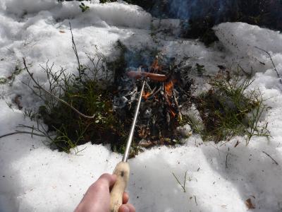Risk Management, bei selbstentfachtem Feuer, Hilfsmittel waren in einem Osterei versteckt, dessen grober Ort auf einer Karte eingezeichnet war. Man beachte den Grillstock, professionell und wiederverwendbar, keine Sorge gehört nicht mir.