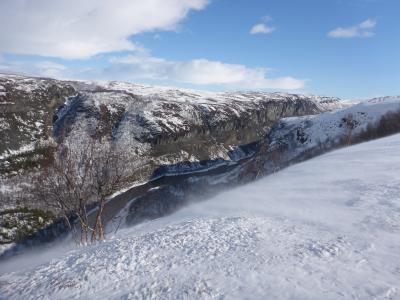 Die Finnen sind nach ihrem Heimaturlaub über Ostern mit dem Auto zurück nach Alta gekommen. Das erweitert den Bewegungsraum erheblich. Am Samstag (11.04.) haben mich zwei von den Finnen abgeholt und wir sind in Richtung Alta Canyon gefahren. Busse fahren hierher nur unter der Woche, einer früh morgens. Etwa 2h ab Parkplatz sind wir auf den Ski unterwegs gewesen. Je höher wir gekommen sind umso offeneres Terrain und umso windiger wurde es. Glücklicherweise waren wir alle resistent genug und niemand hats in den Canyon gelupft oder wurde von einer Böe erfasst.