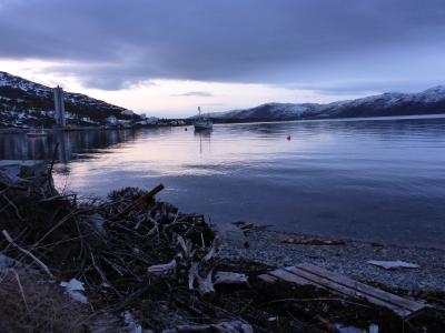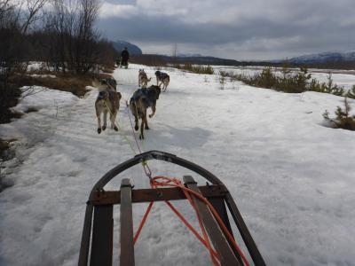 Ein 5erGespann hab ich auf einer ca. 12km langen Strecke gesteuert, bzw. zur Hälfte als Passagier auf dem Schlitten verbracht. Der Besitzer (mehrfacher Gewinner der Finnmarkslopet) meinte, dass es vermutlich eine der letzten Fahrten in dieser Saison ist. Das Wetter hier lässt den Schnee zunehmend schmelzen, das müssen dann ja Plusgrade sein?