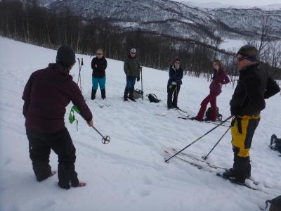 Am Montag (13.04.) hatten wir in WOLA zum ersten June, eine „neue“ Lehrerin. Sie hat versucht im Schnelldurchlauf uns alles bezüglich Lawinen beizubringen. Die regulären Friluftslivstudenten hier haben dafür ein ganzes Semester Zeit. Zumindest die Grundlagen haben wir mit auf den Weg bekommen um am Tag darauf in den Bergen Schnee, Terrain und Wetteranzeichen zu untersuchen. Die Verhältnisse waren allerdings schelcht, beziehungsweise gut - Ansichtssache. Wir konnten keine Lawine auslösen. Aber für Piepser vergraben und den anderen Teil der Gruppe ausbuddeln lassen und umgekehrt hats gereicht. Bei den Mädels sah es zeittechnisch allerdings schlecht aus, wären die Piepser nicht isoliert vergraben, sondern mitsamt Skifahrer, hätt dieser es vermutlich nicht unbeschadet überstanden.